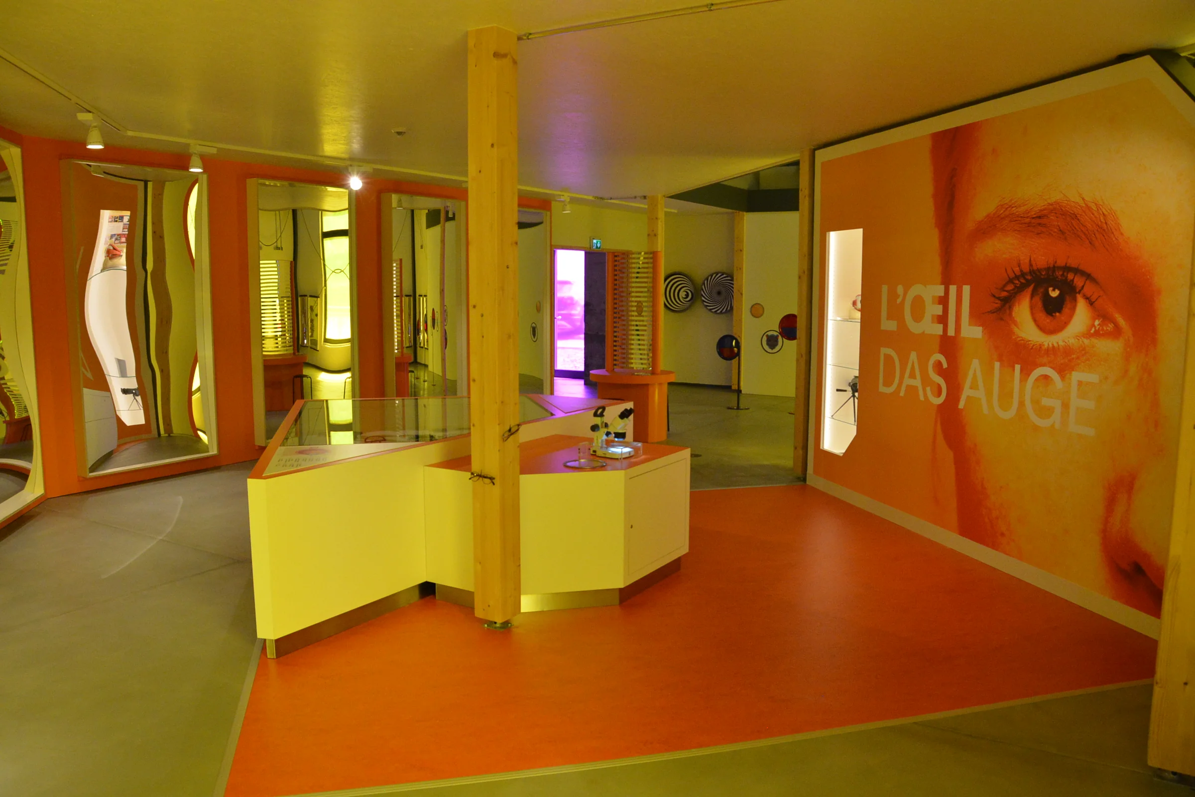 In the exhibition spaces, after a short introduction about the brain and its essential role in the coordination of all senses, each of the senses is presented with a ’shop’. This showcases a series of everyday objects which are used to either improve (think of microscope in case of sight or perfumes in case of the smell) or correct the sense when not working as it should (think of contacts lenses or hearing amplifiers). All around the sense's ‘shop’, several hands-on exhibits are available for visitors to discover and learn more about that sense in an interactive and playful way.